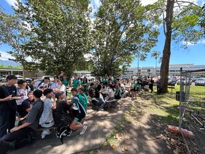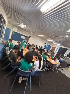 トリニティベイ高校では、授業体験やそれぞれ用意した日本のお土産などを用いて交流しました。お昼は校内でバディと一緒にピザでのランチ交流を行うなど、有意義な学校交流になりました。これから、自主研修班に分かれて市内研修を行います。