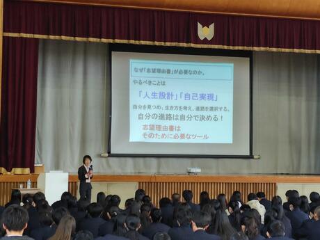 11月19日に第一学習社から森岡厚子様に来校していただき、志望理由書書き方ガイダンスをおこなっていただきました。本日教えていただいた志望理由書を書く際のポイントを、志望理由書を作成する際に活用してくれるはずです!