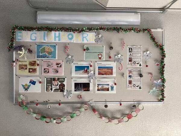 12月のEnglish Boardが完成しました!12日来校のオーストラリアとクリスマスがテーマです。B棟1階昇降口横に展示しています。是非ご覧ください!