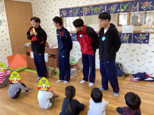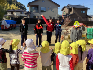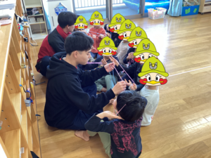 11月17日にも3年選択保育基礎の授業で、京都たからこども園で保育園実習をさせていただきました。園内であやとりをして遊びました。生徒たちは子どもたちと関わる楽しさと、保育士さんの大変さを実感したようです。