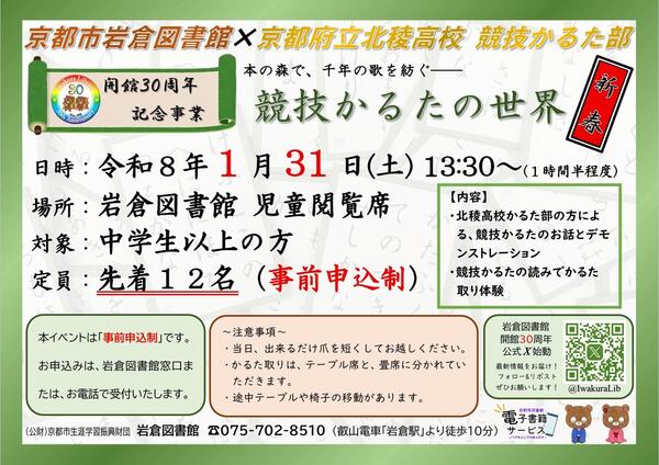 1月31日13:30から岩倉図書館の児童閲覧席で行われる「競技かるたの世界」に競技かるた部が出演します。競技かるたの説明・デモンストレーションを行った後に、体験をしていただく予定です。