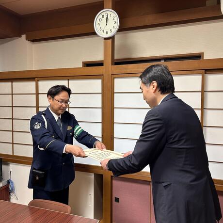 左京署の交通課長から表彰していただきました。保護者の方と教職員の交通安全への取り組みを交通安全協会から評価していただきました。今後も引き続き、安全安心な登下校になるように取り組みや声掛けを行っていきたいと思います。