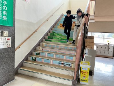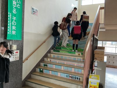 ◆ 卒業記念品 いちばっ子の一日 2026.03.19 3月16日 卒業記念品 卒業生の記念品として、階段アートを作成しました。職員玄関の階段に母校に舞い降りるフクロウが描かれています。不苦労(苦労なし)福来郎(福が来る)といった縁起ものです。 市場小学校へ、また在校生へ思いを込めて作り上げました。すばらしい記念品を残してくれました。 Post Views: 28