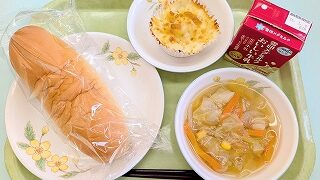 今日の給食は 味付けパン・マカロニグラタン・キャベツとウインナーのスープでした。