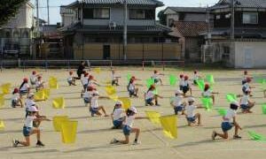 3,4年生の運動会で発表する演技の練習の様子です。フラッグを使用し、ダイナミックな演技を練習しています。本番では「心をひとつに」素晴らしい演技を披露してくれることを楽しみにしています。