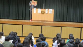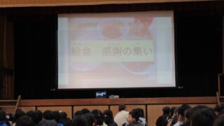 昨日の児童集会で「給食の感謝の集い」を行いました。各学年の代表児童から、日頃の感謝の言葉と、心を込めて作成した給食カレンダーを給食センター所長さんへプレゼントしました。 所長さんからは、子どもたちへの温かい感謝の言葉...