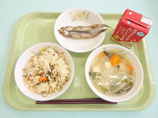今日の給食は 昆布ごはん・焼きシシャモ・京風みそ汁でした。