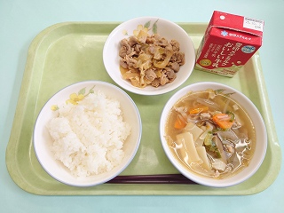 今日の給食は ごはん・ホイコーロー・ワンタンスープでした。