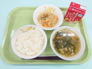 今日の給食は ごはん・焼きビーフン・にらともやしのスープでした。
