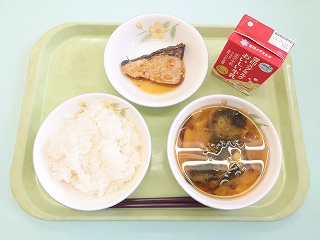 今日の給食は ごはん・アジの香味焼き・具だくさんみそ汁でした。