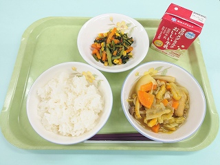 今日の給食は ごはん・カレー鍋・小松菜とコーンの変わり和えでした。