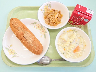 今日の給食は きなこパン・マカロニのクリーム煮・キャベツとウインナーのソテーでした。
