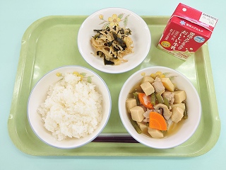 今日の給食は ごはん・高野豆腐の含め煮・甘酢和えでした。
