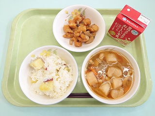 今日の給食は さつまいもごはん・てりやきのこ・麩のみそ汁でした。
