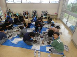 10月31日(金)のカレー作りを実施した後、午後からは焼き板づくりを行いました。横田さんの製材所でカットした板をバーナーで焼き、その板を磨いてペイントする作業となります。子どもたちは黙々と板を磨いています。すてきな作品はできたかな。林間学習の内容を変更して今回は校内でカレーづくりと焼き板づくりを実施しました。今後は森林インストラクターの小川さんに井手町と玉川付近の自然についてレクチャーしていただきながら散策をする予定です。