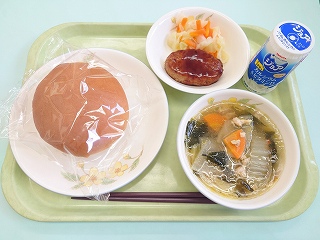 今日の給食は ハンバーガー(バーガーパン、ハンバーグ、ゆでキャベツ)・和風コンソメスープでした。 *今日は牛乳の代わりに発酵乳がつきました。