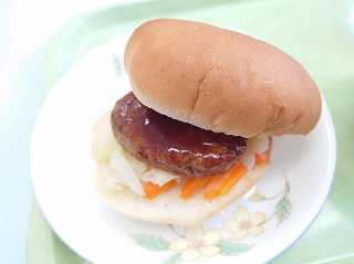 11月最初の給食は、自分でパンに具材をはさんで作るハンバーガーです。みんな楽しそうに作り、大きな口をあけて頬張っていました。