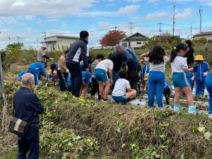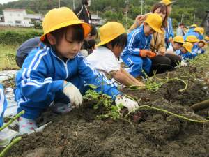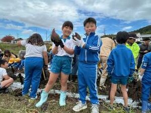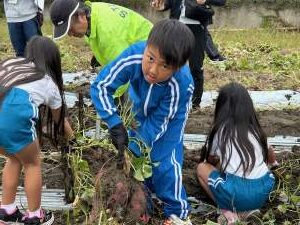 令和7年度本日は、井手町まちづくり協議会のみなさまのご協力により、春に植えたサツマイモの収穫を行いました!今年のサツマイモは例年より大きく豊作だということです。収穫する喜びを子どもたちは体験することができました!みんなでつくった「かかし」が野生動物からサツマイモを守ってくれたかもしれませんね。