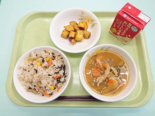 今日の給食は ひじきごはん・豚汁・大学芋でした。