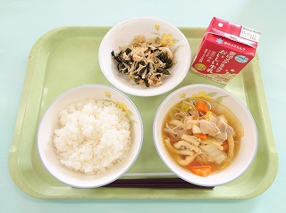 今日の給食は ごはん・ちゃんこ鍋・もやしとツナの和え物でした。