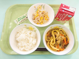 今日の給食は ごはん(少なめ)・カレーうどん・白いんげん豆のサラダでした。