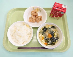 今日の給食は ごはん・鶏肉の唐揚げ・卵とわかめのスープでした。