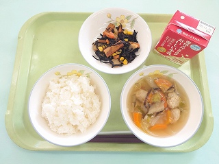 今日の給食は ごはん・鶏団子のくず汁・じゃがいもとひじきの煮物でした。