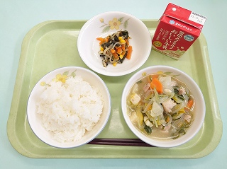 今日の給食は ごはん・鶏肉の水炊き・梅肉和えでした。