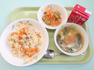 今日の給食は 炊き込みチャーハン・あったか生姜スープ・中華サラダでした。