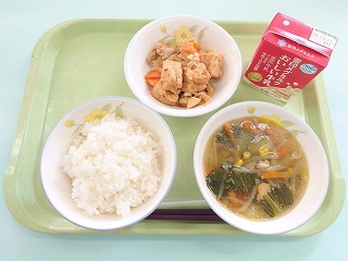 今日の給食は ごはん・家常豆腐(ジャージャンドウフ)・中華スープでした。