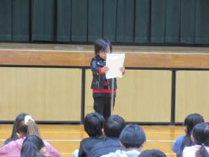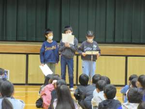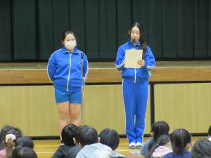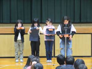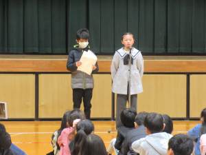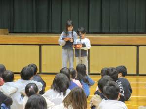 発表する人、発表を聞く人の態度がとても素晴らしく自分の意見をしっかりと全校児童に伝えられる。また、聞く側も真剣に人の意見に耳を傾ける。そのような安心感が体育館いっぱいに漂っていました。