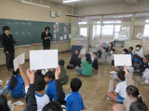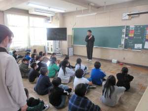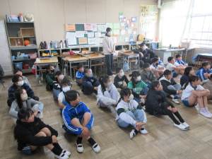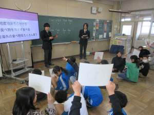 木津高校の説明、「バーチャルウォーター」・「地産地消」のパネルシアター、三択クイズの順番で授業を進めていました。