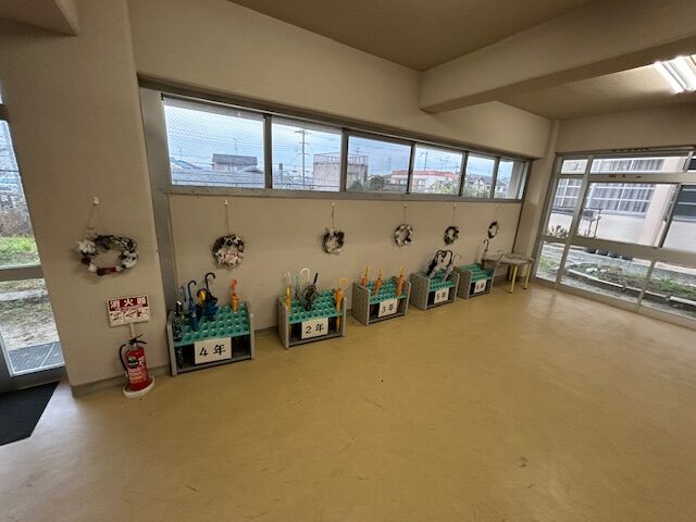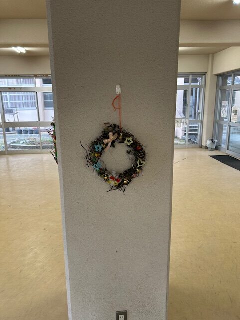 令和7年度澄みわたる空気の冬の朝に、校舎を開けに回っていると「きれいなクリスマスリース」が昇降口に掲示されていました。「クリスマスリース」を見ていると気温は寒いですが、心が温かくなりました。