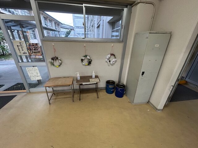 澄みわたる空気の冬の朝に、校舎を開けに回っていると「きれいなクリスマスリース」が昇降口に掲示されていました。「クリスマスリース」を見ていると気温は寒いですが、心が温かくなりました。