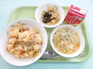 今日の給食は キムチチャーハン・かき玉スープ・甘酢和えでした。