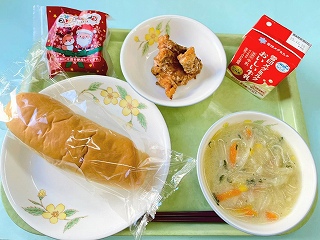 今日の給食は 小型パン・フライドチキン・豆乳コーンスープ・カップケーキでした。