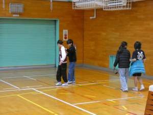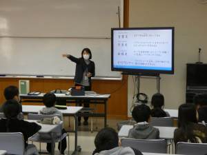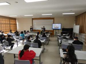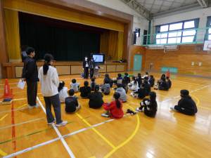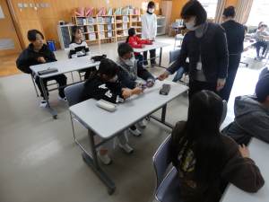 本日の3,4校時に本校の体育館と学習ルームを利用して京都府南部視覚・聴覚支援センターの2名の先生から視覚障害理解学習の授業を行っていただきました。「見えない人の学習や生活について知り、関わり方を考えよう」を題材に授業を進めていただきました。
