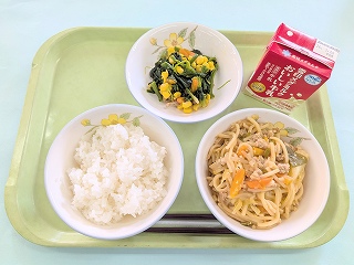 今日の給食は ごはん(少なめ)・みそラーメン・ほうれん草のソテーでした。