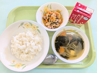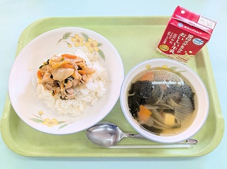 いつもは豚キムチ丼ですが、今日は豚肉を鶏肉に変えて、鶏キムチ丼にしてみました。豚肉とはまた違った味わいで、おいしかったですね。低学年には少しからかったようですが、みんなモリモリ食べてくれて、残食もほとんどありませんでした。