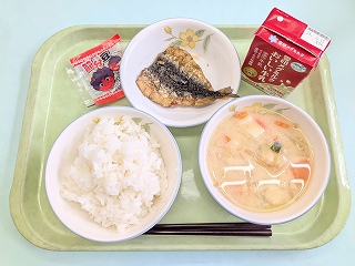今日の給食は ごはん・イワシの蒲焼風・まめまめみそ汁・福豆でした。