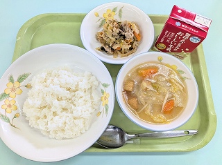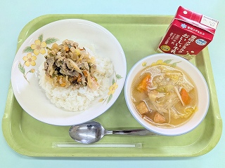 今日の給食は ねぎ塩豚丼(ごはん、ねぎ塩豚丼の具)・白菜と厚揚げのみそ汁でした。