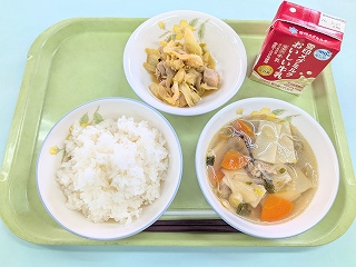 今日の給食は ごはん・鶏肉のホイコーロー・ワンタンスープ でした。