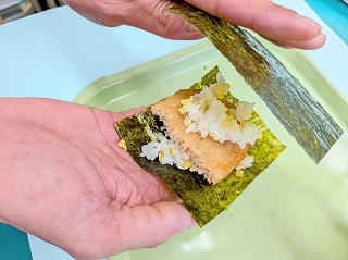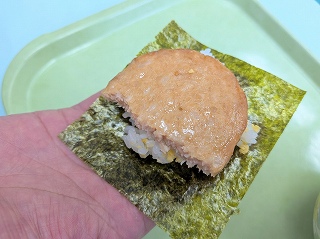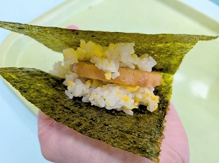 今日の給食は ポーク卵おにぎり(炒り卵入りごはん、焼きのり、ボロニアソーセージ)・ソーキ汁でした。