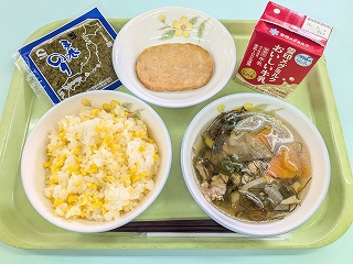 今日は6年ろ組から選ばれた献立です。旅行に行ったときに食べた沖縄料理のおいしさを、みんなに知ってもらいと考えてくれました。