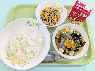 今日のすまし汁には、白玉麸を入れました。戻したときはまん丸だったのですが、汁に入れて、給食時間になると、なぜか楕円形に…。なので、卵や大豆に見えたようで、「食べたら、ふわっとしていて、ビックリした!」という子が何人もいました。