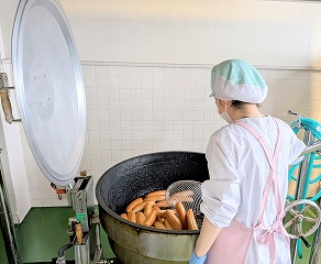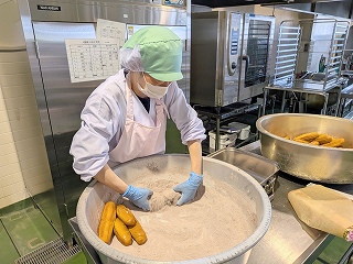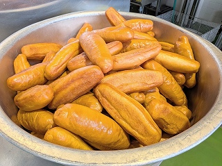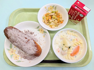 給食では、きなこパン・ココアパン・きなこっ茶パンの3種類の揚げパンが登場しますが、その中でも人気上位なのがココアパンです。みんな口の周りをココアで真っ黒にしながら、おいしそうに頬張っていました。あま~いココアパンに合うように、マカロニのクリームには、米粉を使ってあっさりと仕上げました。