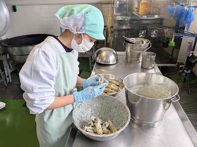 衣をつけている調理員さんが、ジーッとちくわの穴を見つめていました。何をしているか聞くと、穴の中に衣がたくさんついていると、揚げ上がりの食感や油切れが悪くなるため、確認して取り除いているとのこと。みんなにおいしい給食を届けようと、少しの手間も惜しまずに頑張ってくれる調理員さんに感謝です。