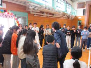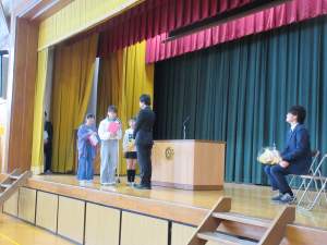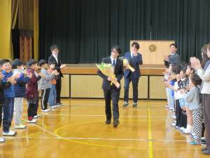 離任される先生方からは、子どもたちへの思いやこれまでの思い出、そして温かい励ましの言葉が贈られました。子どもたちは真剣な表情で耳を傾け、ときには笑顔、ときには涙を見せながら、先生方との別れをかみしめていました。代表児童からの感謝の言葉や花束の贈呈では、これまでの感謝の気持ちがあふれ、会場は温かな雰囲気に包まれました。