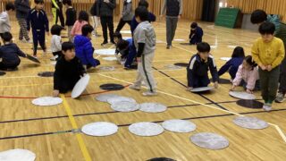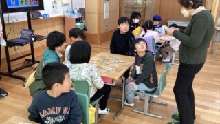 低学年では、遊びの指導で「昔遊び」に挑戦しています。最初は、「たこあげ」から始まり、「だるまさんがころんだ」や「ふくわらい」、「だるまおとし」や「そり遊び」、「かるた」等、いろいろな昔遊びへと広がっていっています。一人で取り組む遊びや集...