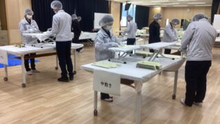 高等部1年生の校内実習が始まりました。ランチルームと会議室を職場に見立て、福祉作業所からご提供いただいた作業に取り組みます。扱う資材は全て製品として使用されるものです。